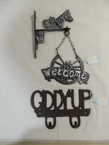 LOT 2 CAST IRON WESTERN STYLE WALL MOUNT WELCOME & WESTERN STYLE 2 HOOK RACK. AS SHOWN. VIEW PICTURE FOR DETAIL.