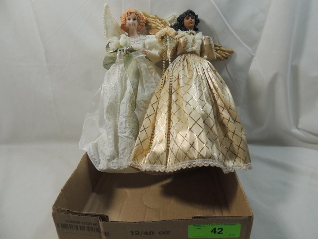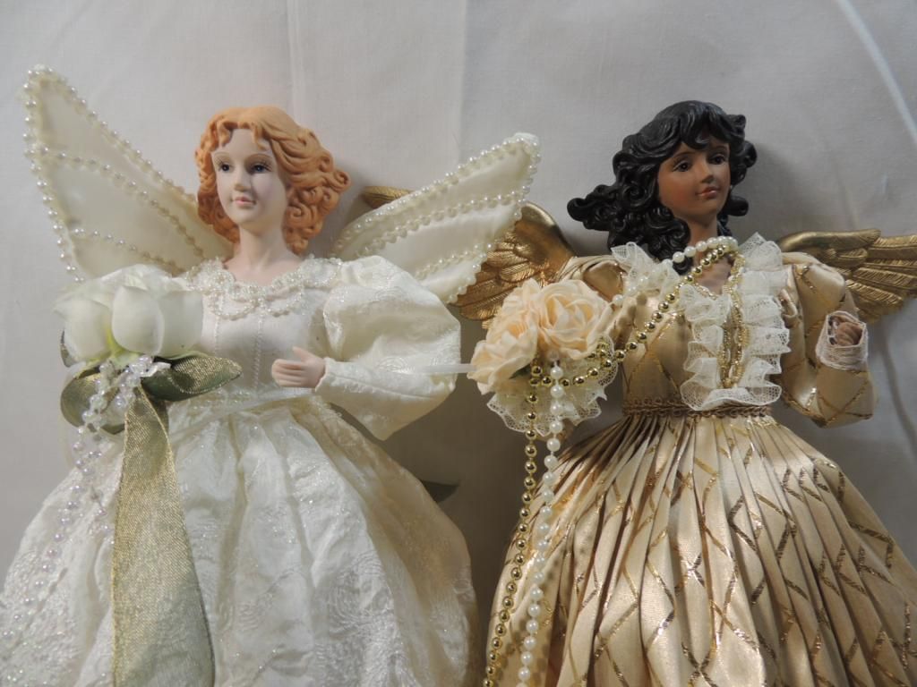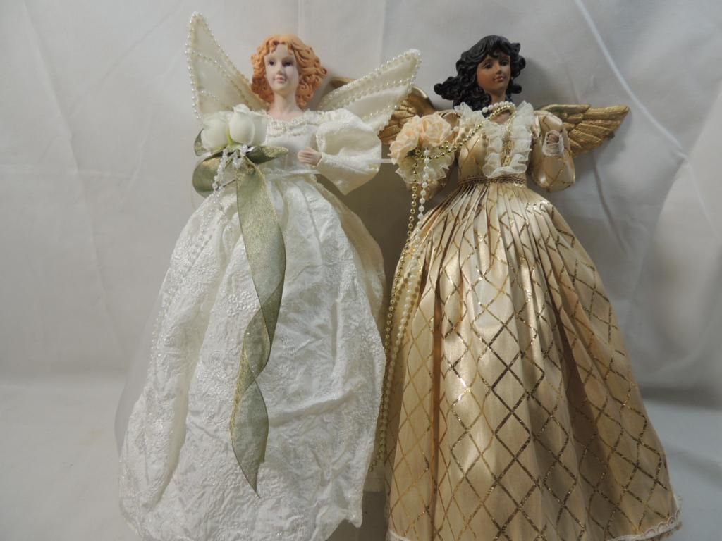 LOT 2 CHRISTMAS TREE TOPPER ANGELS. WHITE DRESS AND GOLD DRESS. AS SHOWN. SEE PHOTO FOR MORE DETAILS.