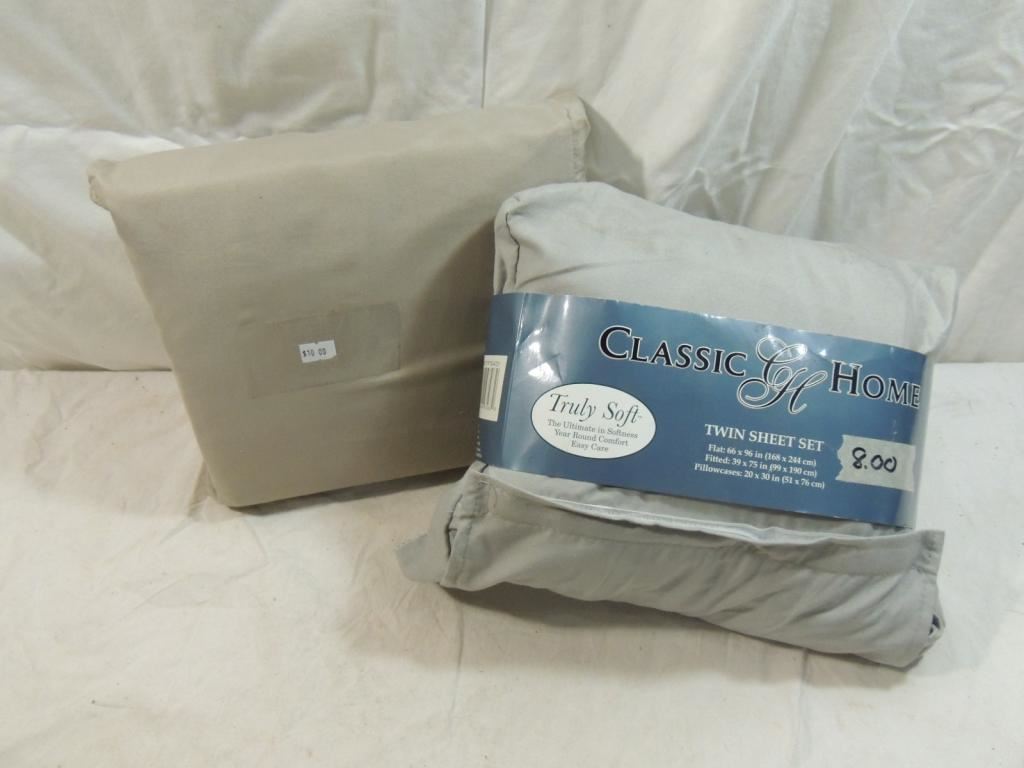 GREY AND TAN TWIN SHEET SETS, GLASSIC HOME, EXTRA SOFT DECORATIVE SHEETS AS SHOWN SEE PHOTO FOR MORE DETAILS.
