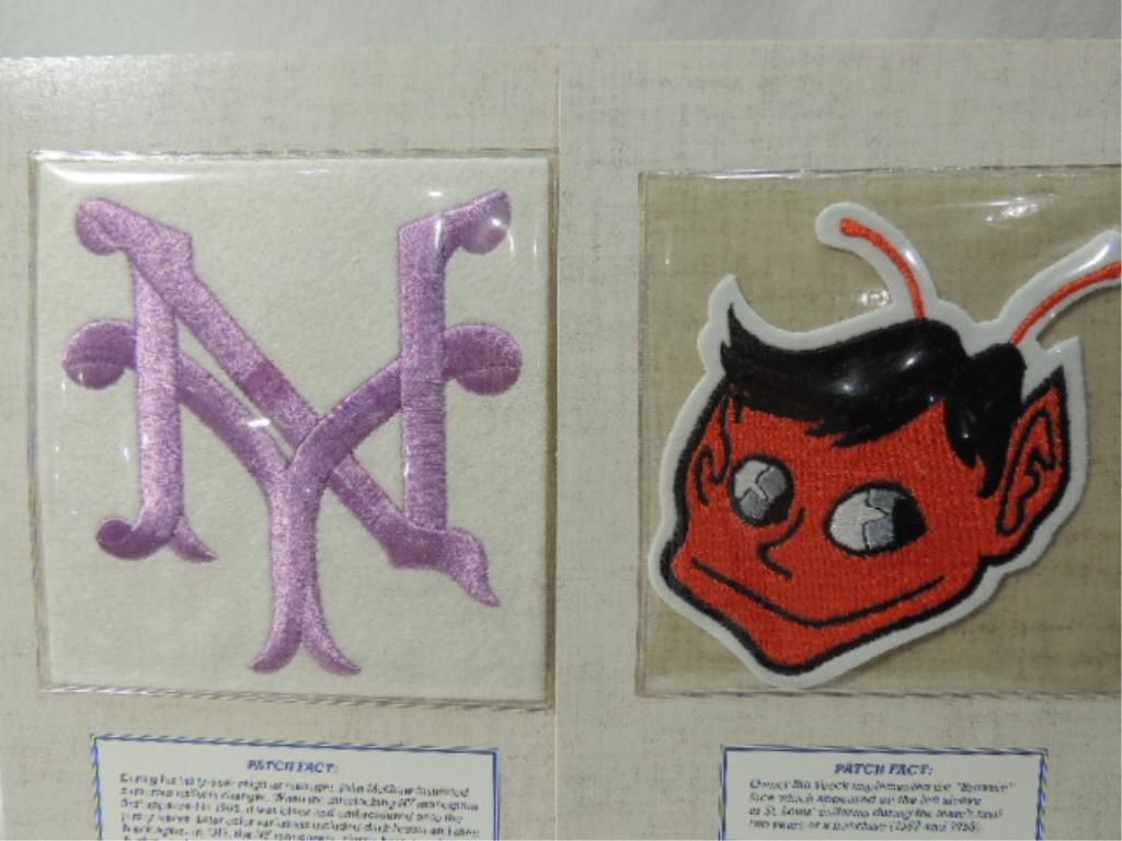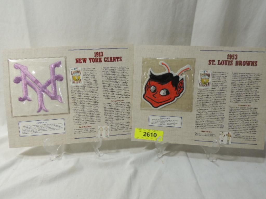 LOT 2 COLLECTORS PATCHES. 1953 ST LOUIS BROWNS AND 1913 NEW YORK GIANTS. MOUNTED ON COLLECTOR PAGE, PART OF WILLABEE WARD COOPERSTOWN COLLECTION. SEE PICTURES FOR DETAILS