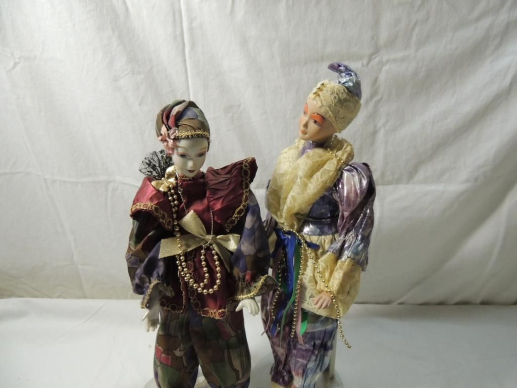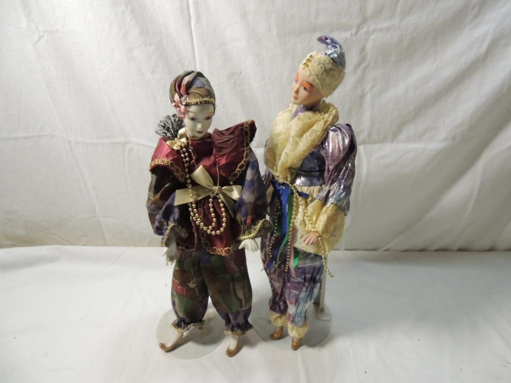 COURT JESTER MUSICAL ANIMATED PORCELAIN COLLECTIBLE DOLL ON STAND. COURT JESTER CLOWN DOLL. VINTAGE DECORATIVE DOLL. AS SHOWN. SEE PHOTO FOR MORE DETAILS.