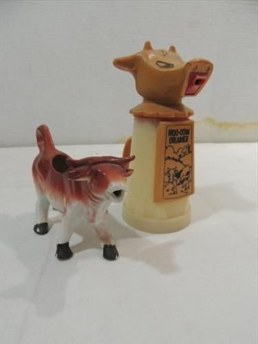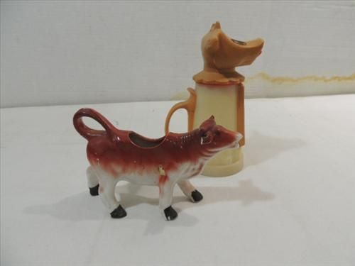 LOT 2 COW CREAM POURERS, CERAMIC & PLASTIC. AS SHOWN. VIEW PICTURE FOR DETAIL.