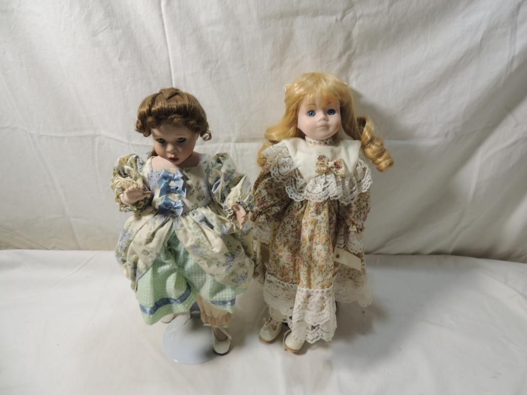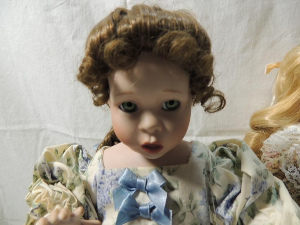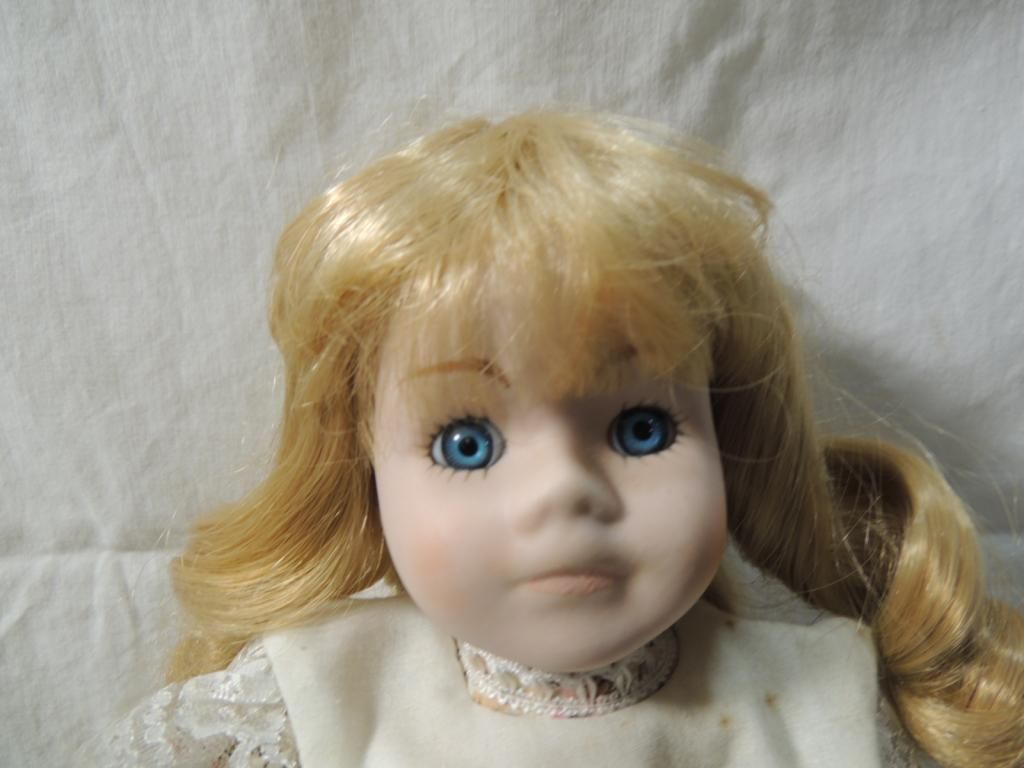 PORCELAIN "MARY LOUISE" DOLL AND 14" TALL ON STAND. GREEN SMALL PLAID AND BLUE AND CREAM FLORAL DRESS. BROWN HAIR IN BRAIDS WITH BLUE RIBBONS. GREEN EYES. AS SHOWN. SEE PHOTO FOR MORE DETAILS.