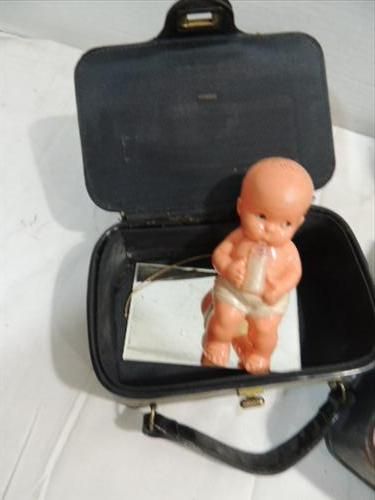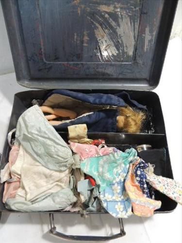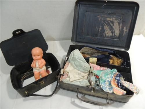 LOT 2 DOLL CLOTHES CARRY CASES: 1 PRESS METAL WITH DOLL CLOTHES & PATTEN LEATHER CASE WITH DOLL. AS SHOWN. VIEW PICTURE FOR DETAIL.