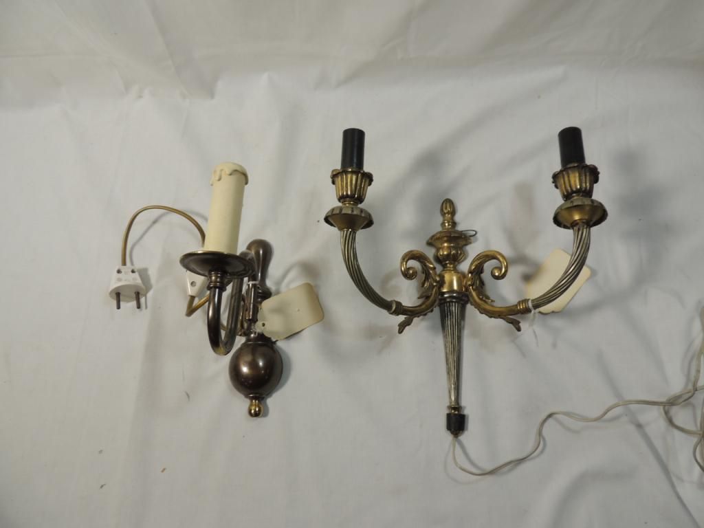 ELECTRIC EUROPEAN BRASS SINGLE AND DOUBLE LIGHT WALL SCOUNCE. EUROPEAN PLUGS. AS SHOWN SEE PHOTO FOR MORE DETAILS.