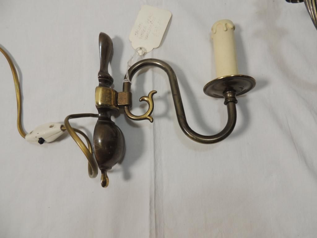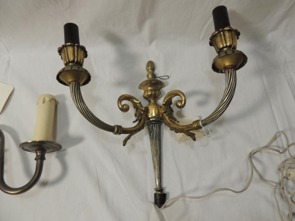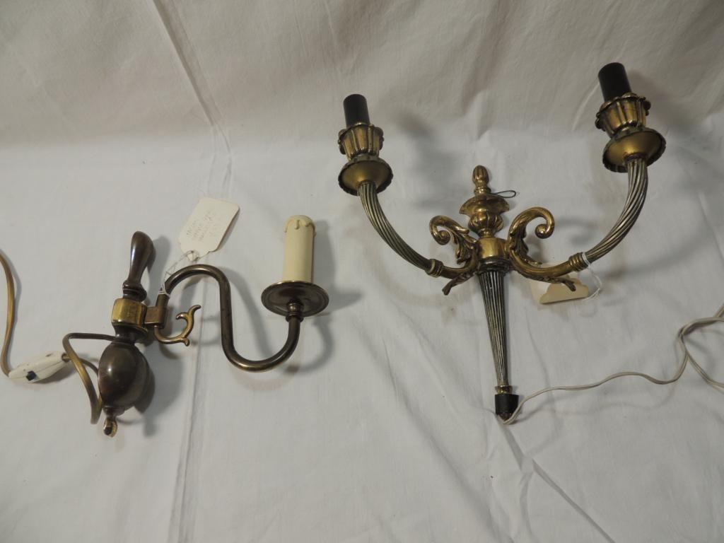 ELECTRIC EUROPEAN BRASS SINGLE AND DOUBLE LIGHT WALL SCOUNCE. EUROPEAN PLUGS. AS SHOWN SEE PHOTO FOR MORE DETAILS.