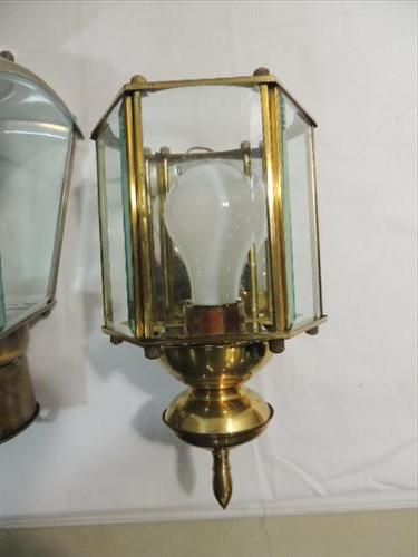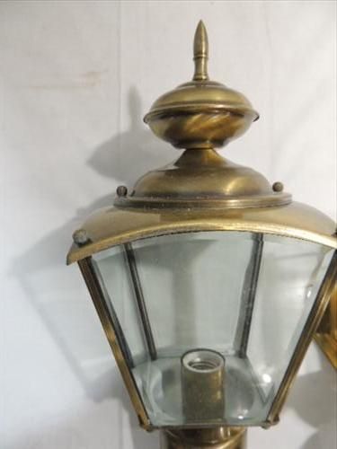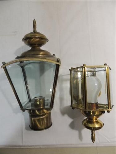 LOT 2 EXTERIOIR LIGHTING: 1 LAMP POST BRASS LIGHT & 1 WALL MOUNT BRASS LIGHT. BEVELED GLASS. AS SHOWN. VIEW PICTURE FOR DETAIL.
