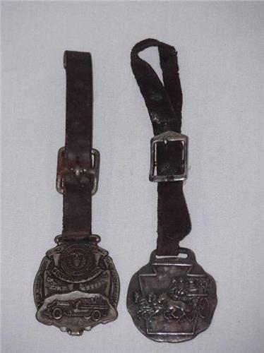 LOT (2) FIRE RELATED WATCH FOBS W/ STRAPS: (1) HORSE DRAWN NORTHAMPTON PA and (1) MOTORIZED FIRE ENGINE UNIONTOWN PA - WEAR and LOSSES TO STRAPS;
