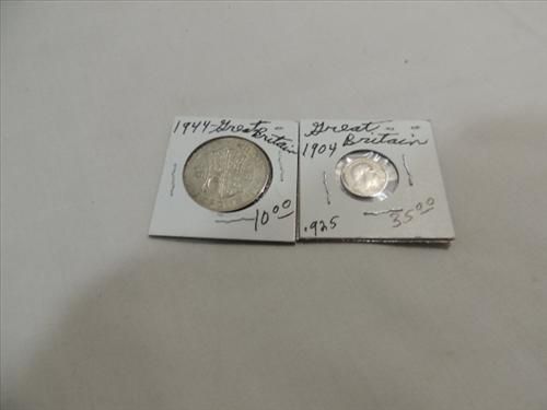 LOT 2 FOREIGN SILVER COINS GREAT BRITIAN 1904 3 PENCE & 1944 HALF CROWN. AS SHOWN. VIEW PICTURE FOR DETAIL.