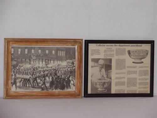 LOT (2) FRAMED ITEMS: COLLECTOR RESCUES GOODWILL #3 PUNCH BOWL and STEEL ENGRAVING OF FIREMENS PARADE - WEAR and TONING;