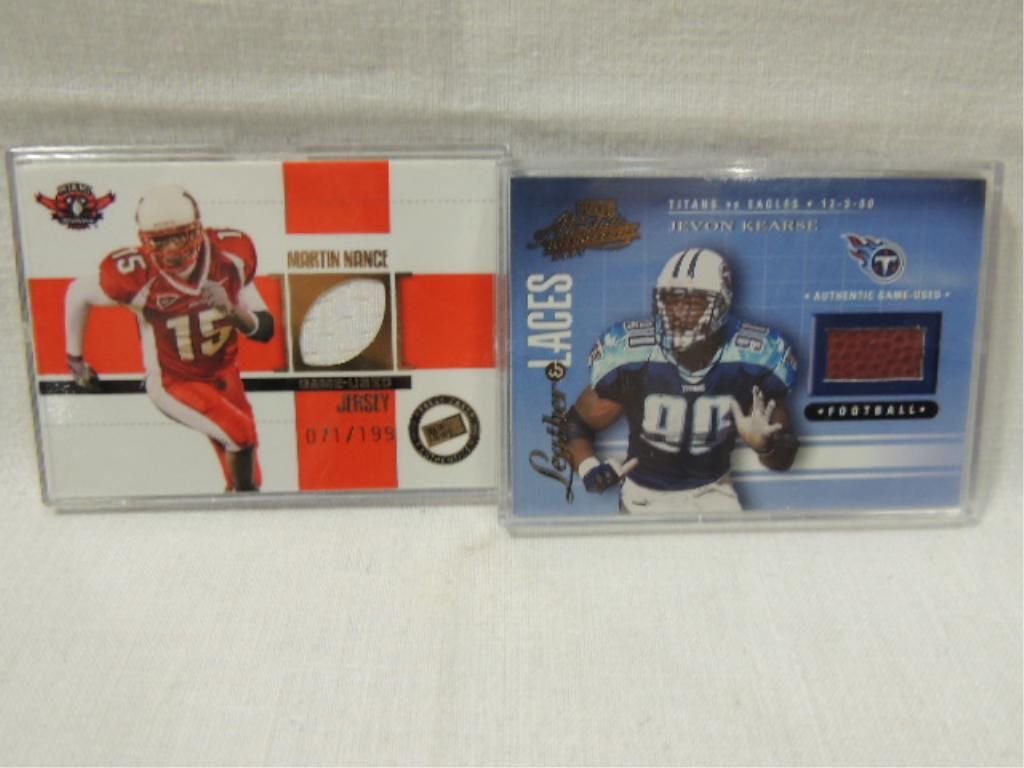 LOT 2 FOOTBALL PLAYER CARDS. MARTIN NANCE GAME USED JERSEY CARD. JEVON KEARSE GAME USED FOOTBALL CARD. AS SHOWN SEE PHOTO FOR DETAILS.