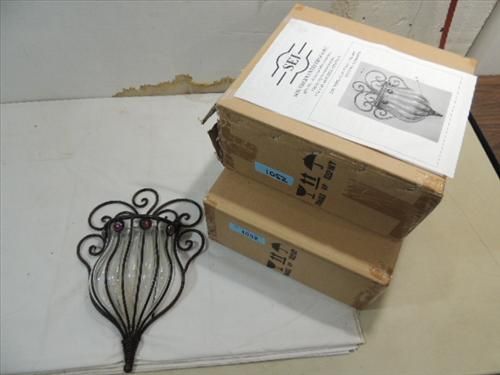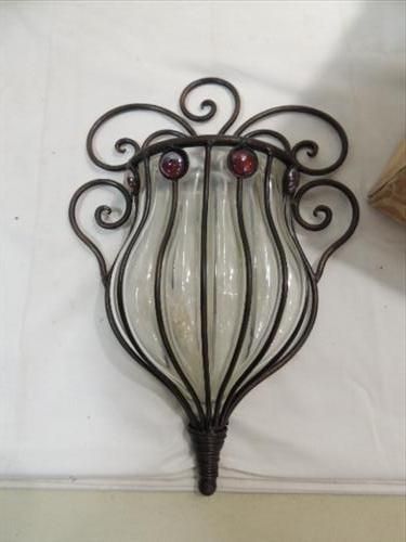 LOT 2 GLASS & WROUGHT IRON WALL MOUNT VASES. 11"L. AS SHOWN. VIEW PICTURE FOR DETAIL.