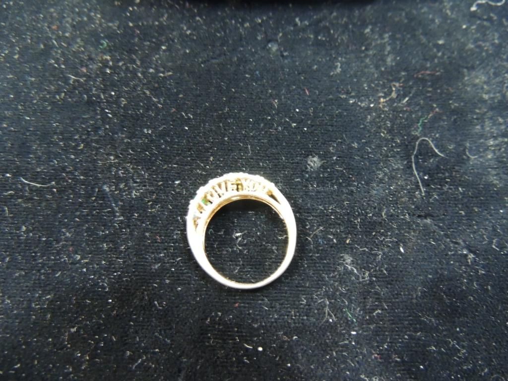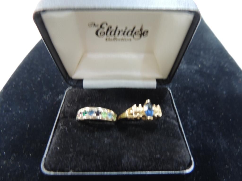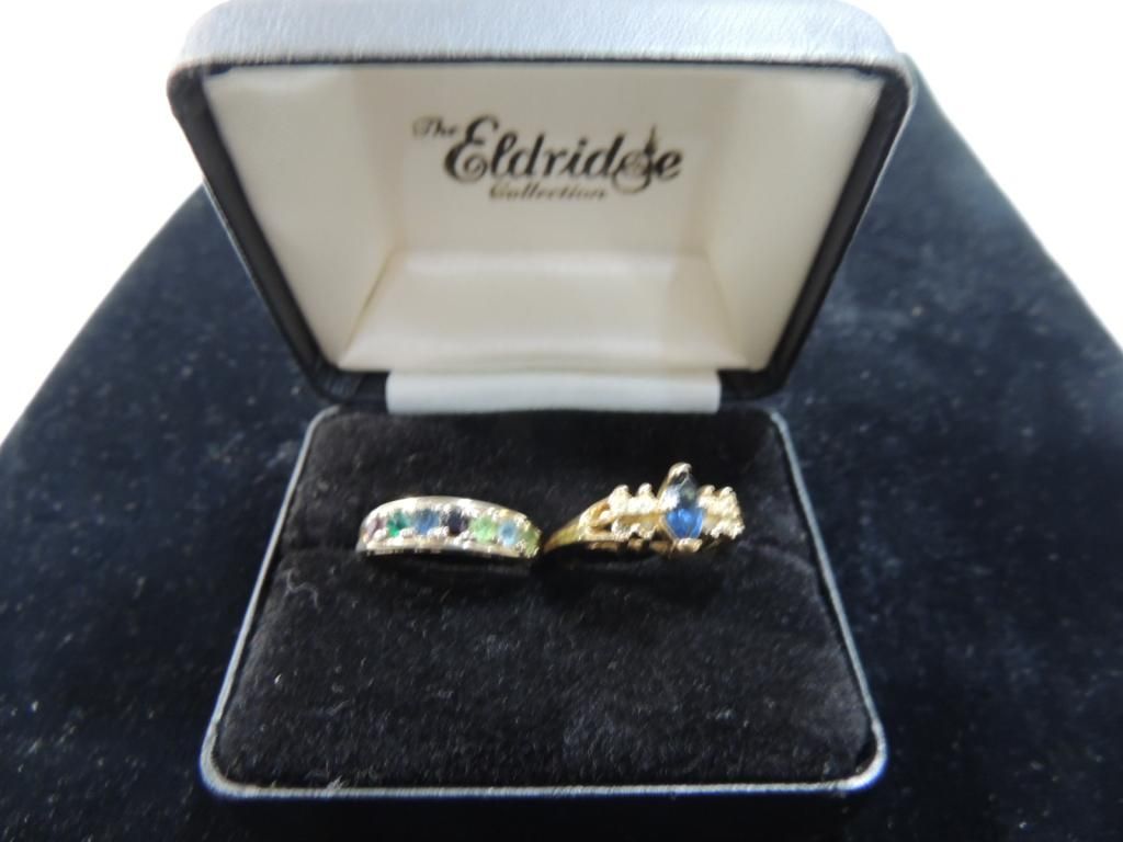 10G BLUE JEWEL SIDE STONE MARQUISE CUT RING GOLDTONE SETTING. MOTHERS RING WITH I LOVE YOU SIDE AS SHOWN SEE PHOTO FOR MORE DETAILS.