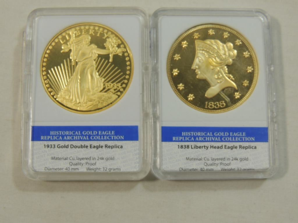 1933 GOLD DOUBLE EAGLE REPLICA, 1838 LIBERTY HEAD EAGLE REPLICA COIN COLLECTIBLE CURRENCY COLLECTIBLE UNITED STATES CURRENCY US CURRENCY GOOD CONDITION HIGHLY COLLECTIBLE AS SHOWN SEE PHOTO FOR MORE DETAILS.