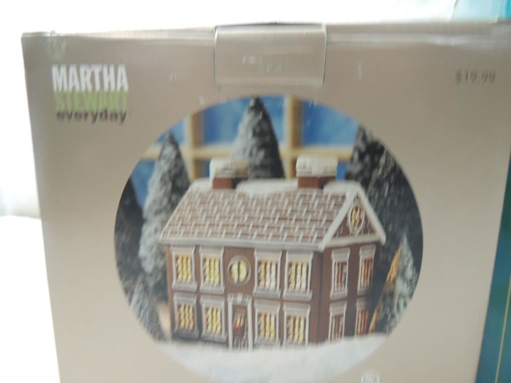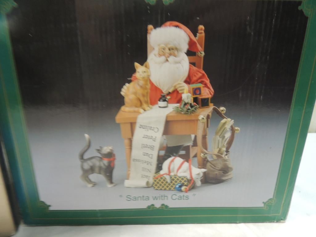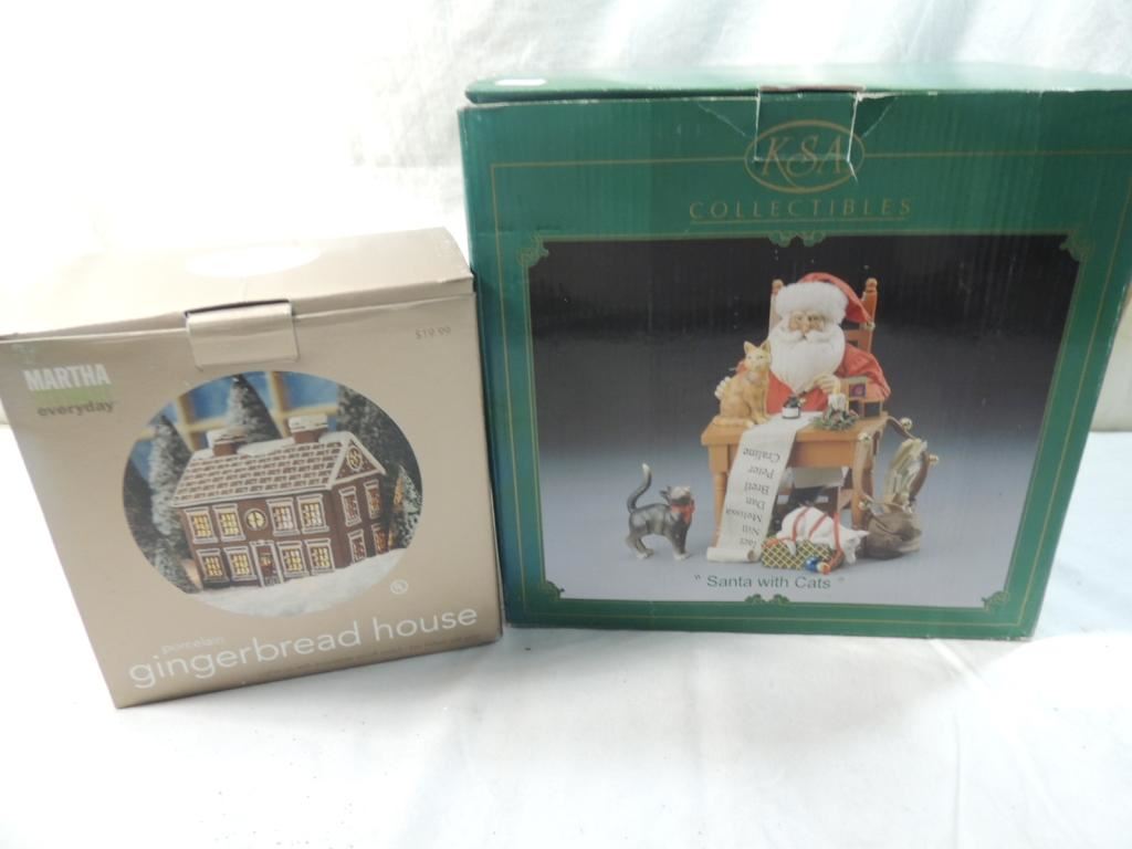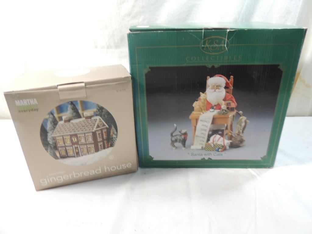 PORCELAIN GINGERBREAD HOUSE, SANTA WITH CATS FIGURE, DISPLAY, DECORATIVE, COLLECTIBLE AS SHOWN SEE PHOTO FOR MORE DETAILS.