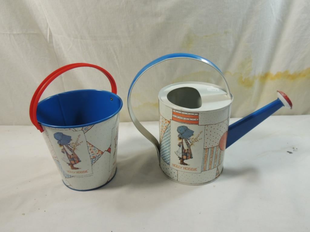 HOLLY HOBBIE BUCKET AND WATER CAN, VINTAGE TIN METAL BUCKEY AND WATERING CAN COLLECTIBLE AS SHOWN SEE PHOTO FOR MORE DETAILS.