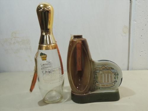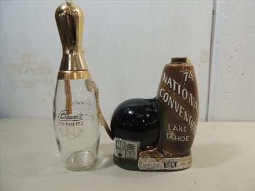 LOT 2 JIM BEAM WHISKEY DECANTERS BOWLING TOPICAL: GLASS BOWLING PIN #8, CERAMIC 1974 NATIONAL CONVENTION BPAA.  AS SHOWN.  VIEW PICTURE FOR DETAIL.