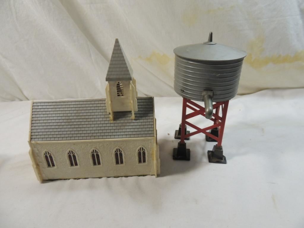 MODEL TRAIN FIGURINES VINTAGE CURCH AND TOWER WATER TOWER MODELS AS SHOWN SEE PHOTO FOR MORE DETAILS.