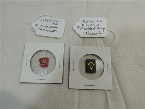 LOT 2 MASONIC SYMBOL ON STONE & SIZE: RUBY 11.8X10X8.2MM & BLACK ONYX 14X10MM. AS SHOWN. VIEW PICTURE FOR DETAIL.