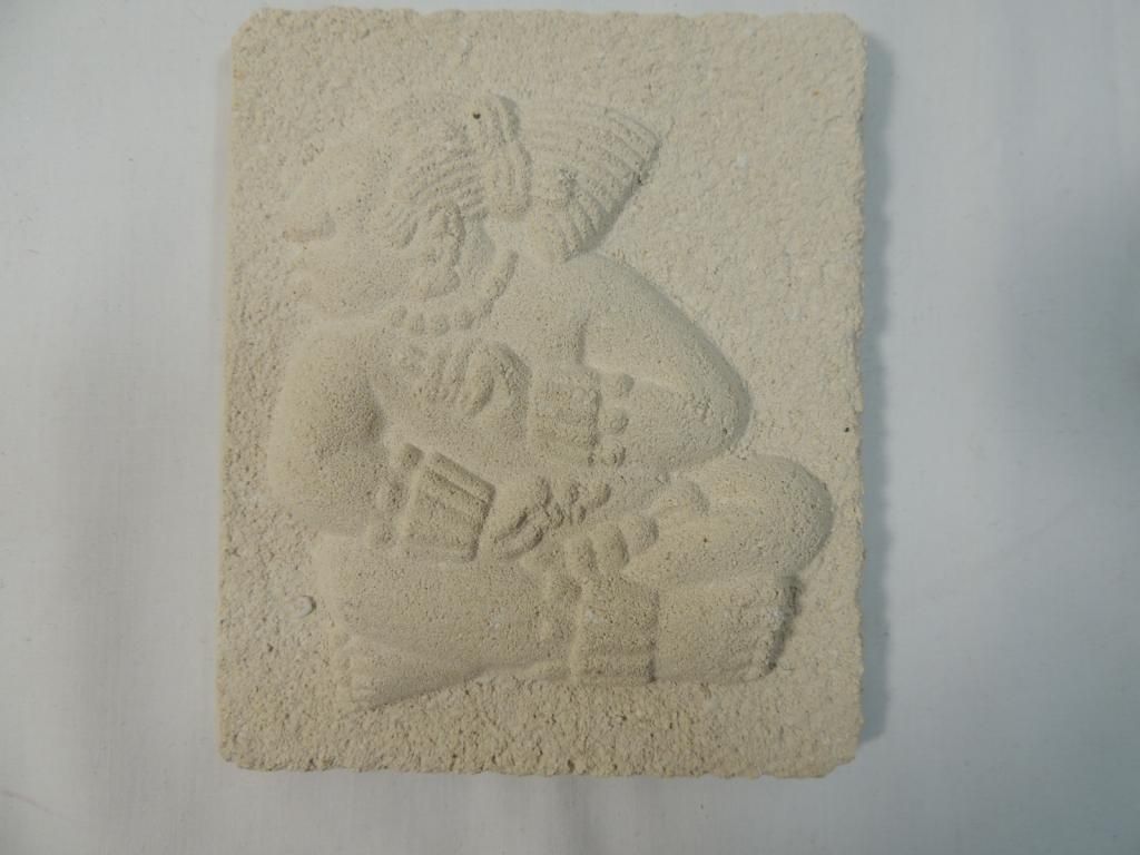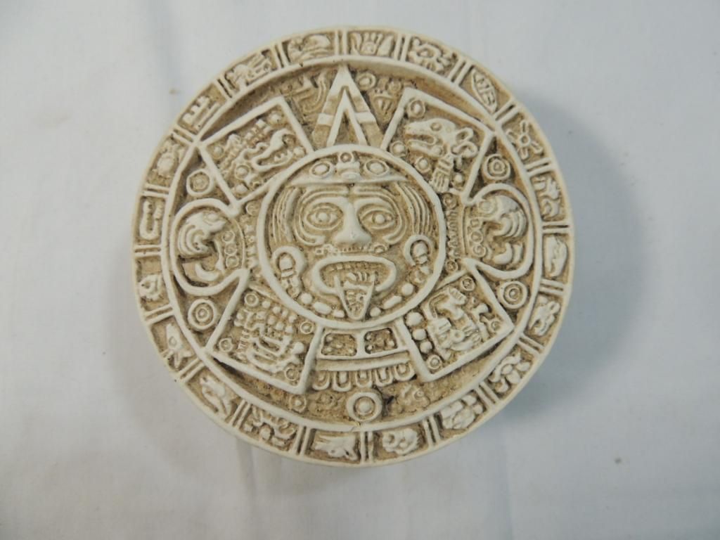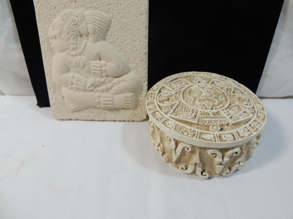 REPLICA OF AN ANCIENT MAYAN ENGRAVING FOUND AT THE PALENQUE RUINS DEPICTING ONE OF THE WAYS IN WHICH THEY EXPRESSED THE NUMBER ZERO & DECORATIVE ROUND BOX. AS SHOWN SEE PHOTO FOR MORE DETAILS.