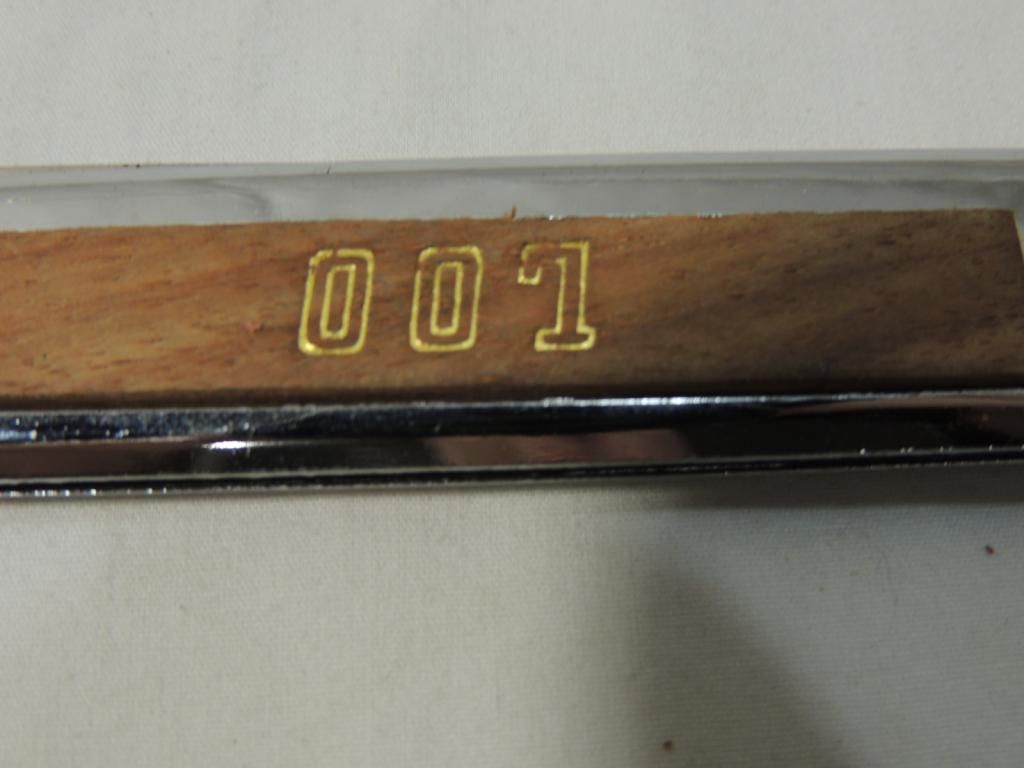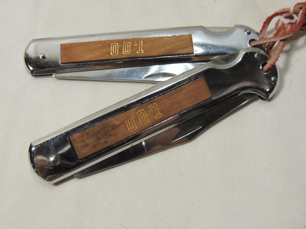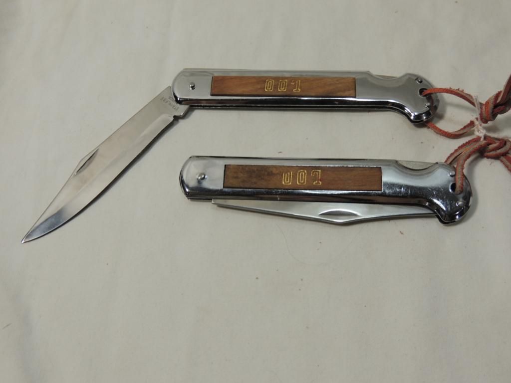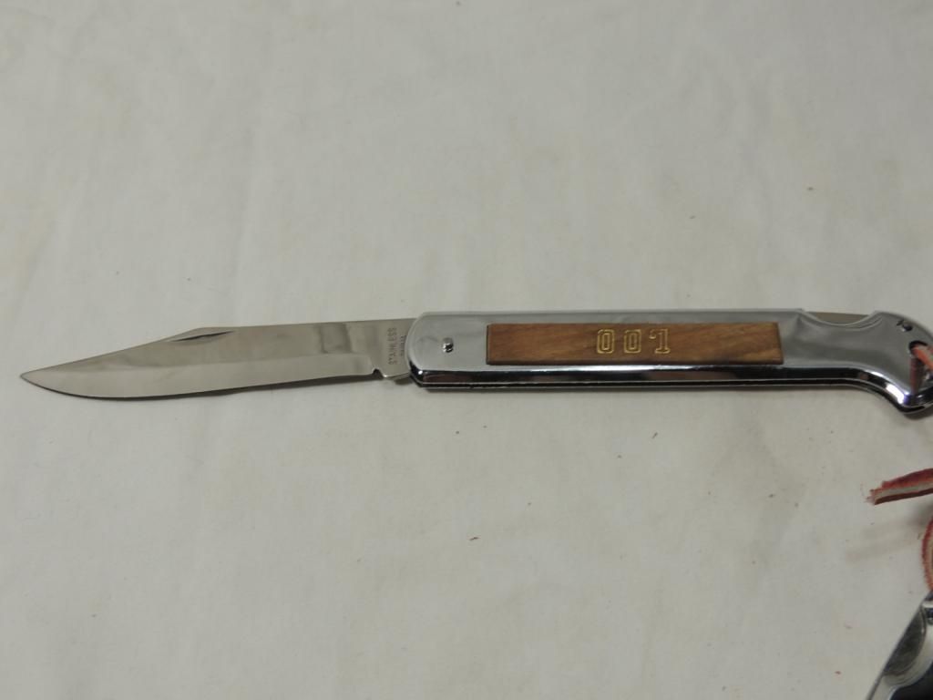 LOCKING POCKET KNIFE. WOOD PLATE ON HANDLE 007 STAINLESS BLADE 4" BLADE. AS SHOWN. SEE PHOTO FOR MORE DETAILS.