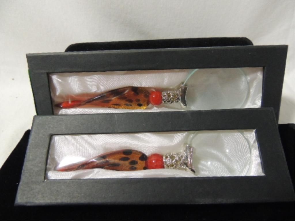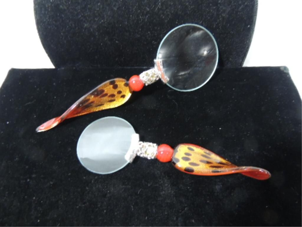 LOT 2 MURANO STYLE GLASS HANDLE HAND HELD MAGNIFYING GLASS. TWO DIFFERENT SIZES 6" & 7" AS SHOWN. VIEW PICTURE FOR DETAIL.