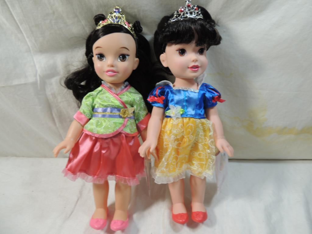 SNOW WHITE & MULAN MY FIRST DISNEY PRINCESS DOLL, FAIRYTALE PRINCESS, VINYL DOLL 14" DOLL, GREAT CONDITION, AS SHOWN SEE PHOTO FOR MORE DETAILS.