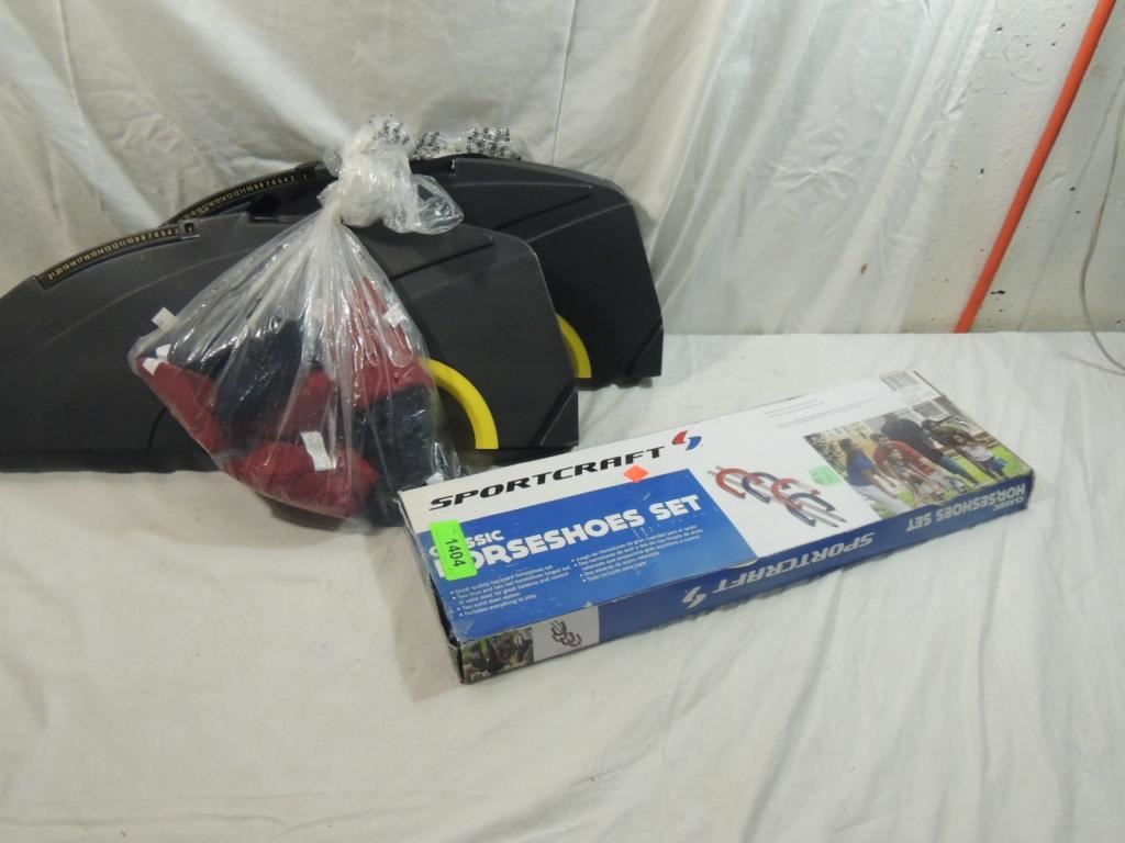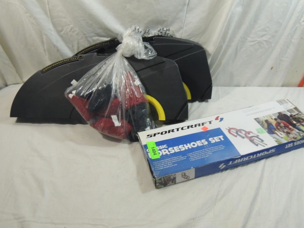 HORSESHOES, AND BEANBAG THROW, PLASTIC PORTABLE GAMES, HORSESHOE GAME AS SHOWN SEE PHOTO FOR MORE DETAILS.