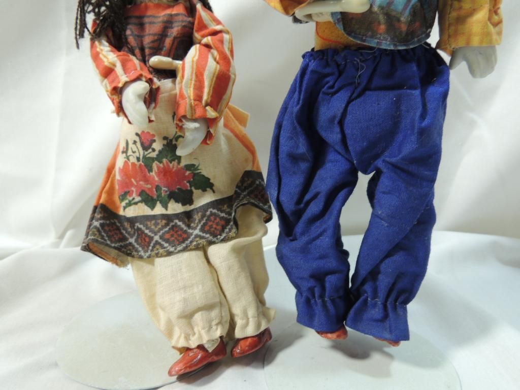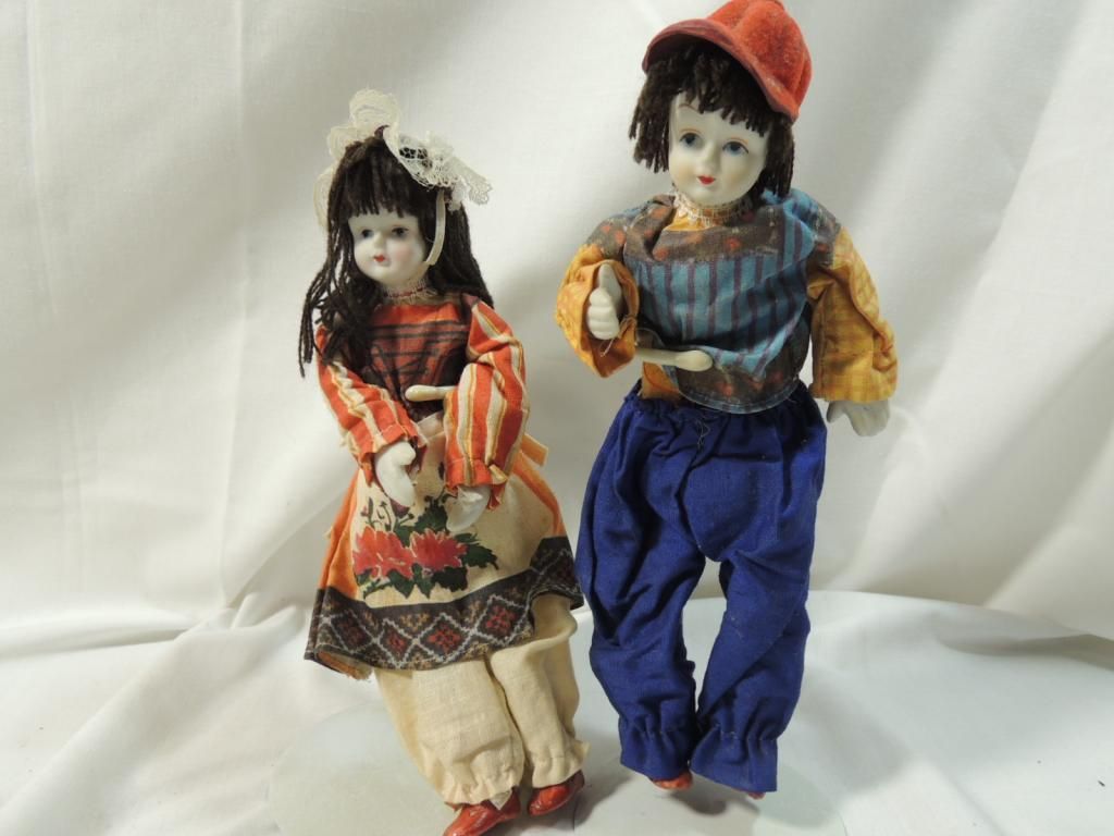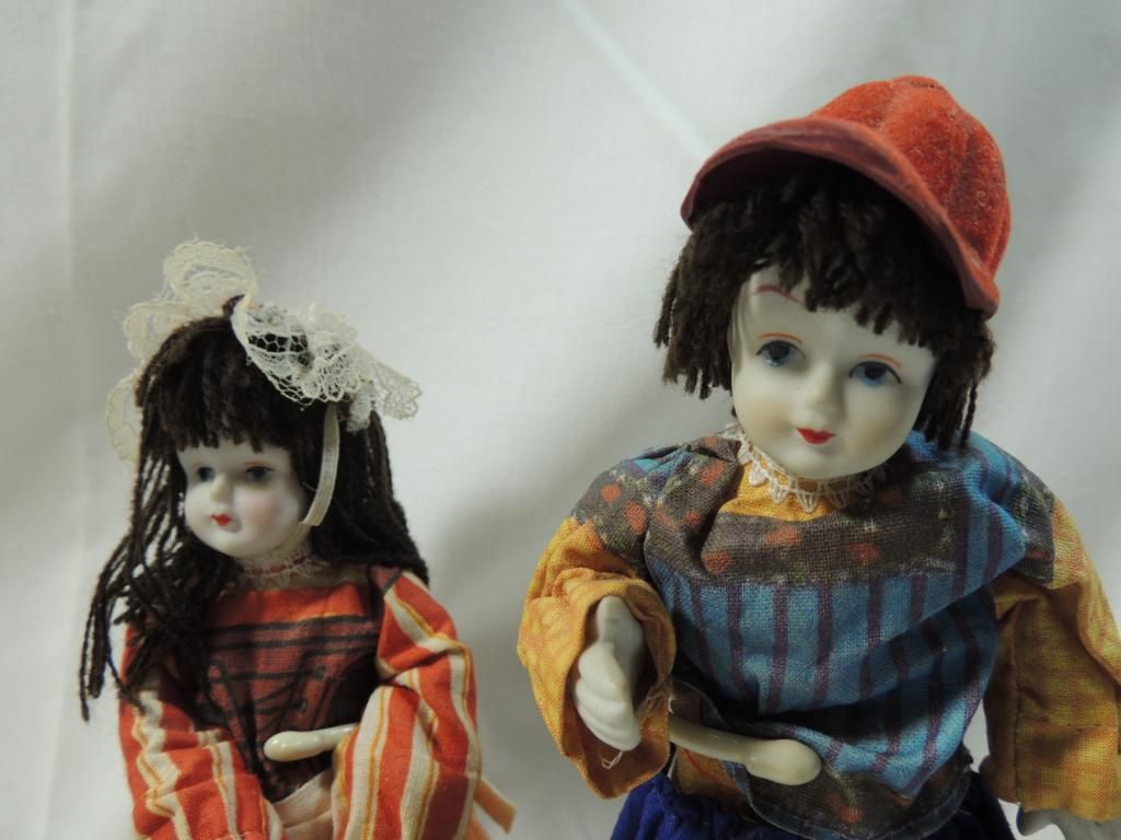 TWO SMALL PORCELAIN DOLLS WITH STAND. BOY AND GIRL. AS SHOWN. SEE PHOTO FOR MORE DETAILS.