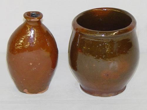 LOT (2) PCS. OF NEW ENGLAND REDWARE: (1) 5 1/4" REDWARE FLASK-MINOR GLAZE LOSSES, & (1) 4 3/4" REDWARE JAR-MINOR CHIPS ON BASE RIM