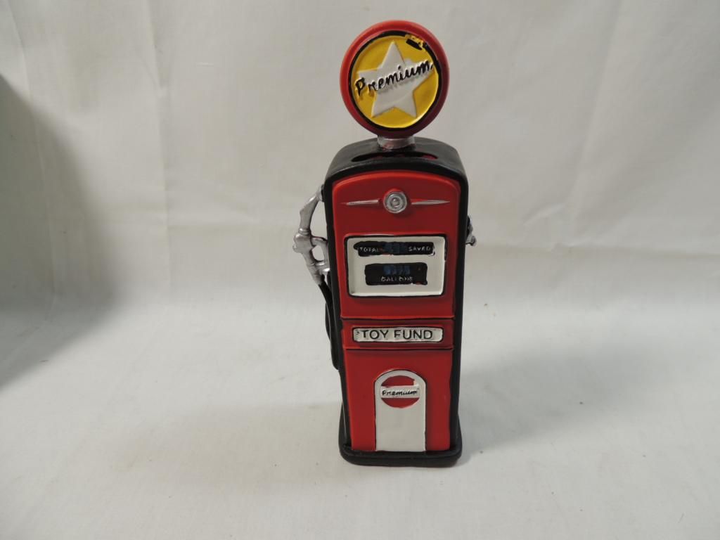PETROL STATION COIN BANKPETROL STATION COIN BANK. NEW IN BOX. DECORATIVE VINTAGE PETROL STATION STYLE COIN BANK. AS SHOWN. SEE PHOTO FOR MORE DETAILS.