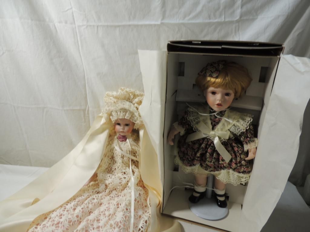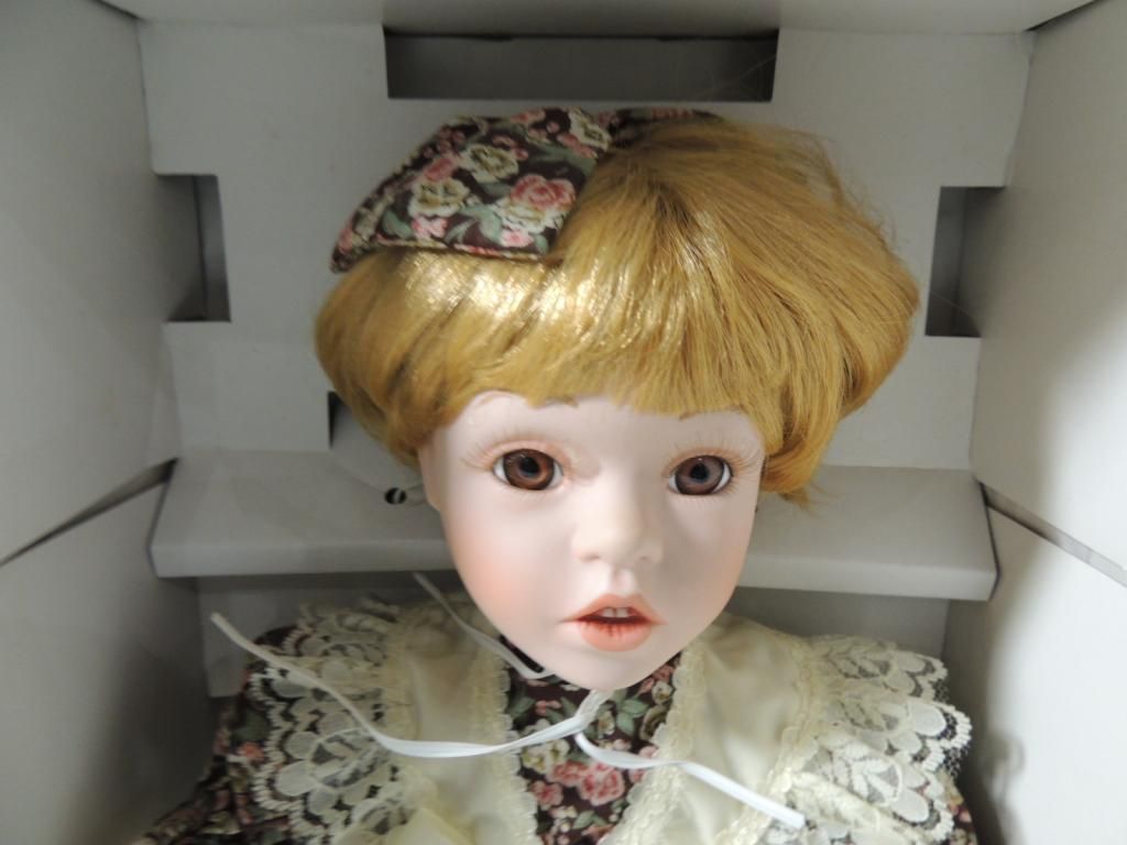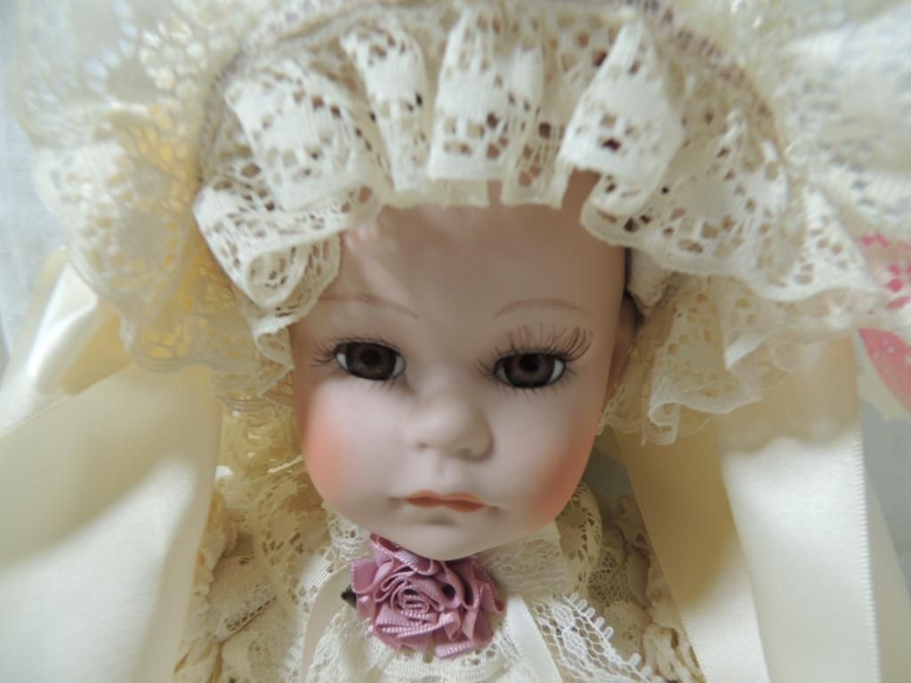HUGS & KISSES "TIFFANY" PORCELAIN DOLL AND LONG CHRISTENING DRESS LARGE LONG SATIN RIBBONS. ROSE RIBBON FLOWERS. BONNET. COLLECTIBLE DOLL. IN BOX. COLLECTORS. GOOD CONDITION. AS SHOWN. SEE PHOTO FOR MORE DETAILS.