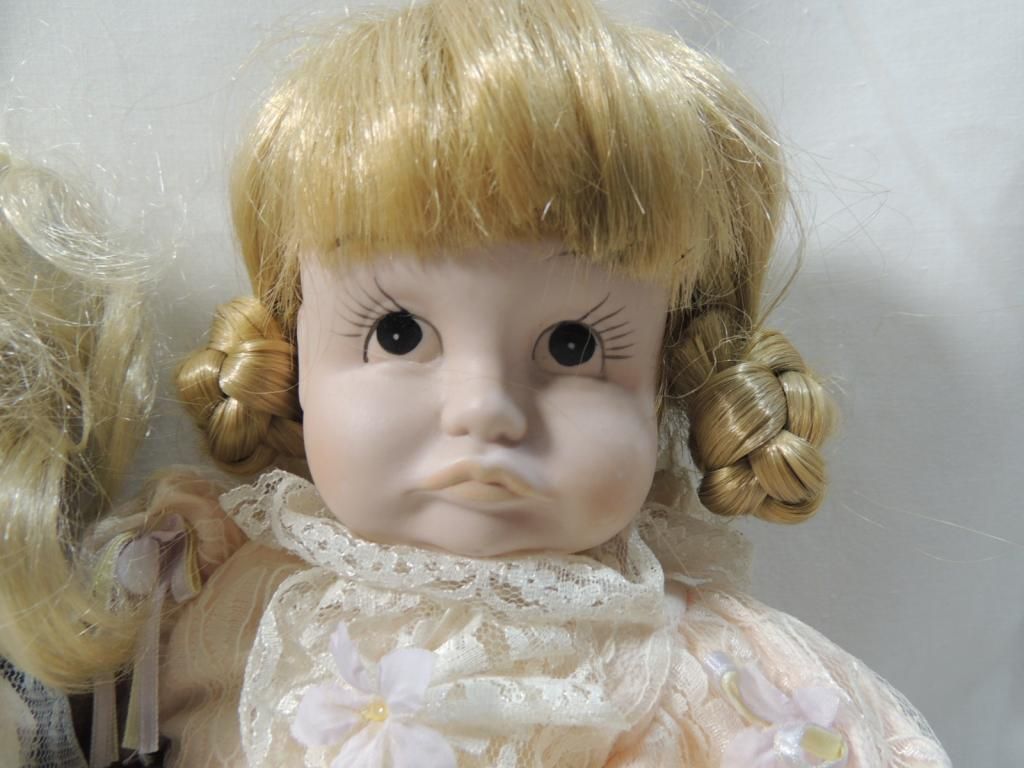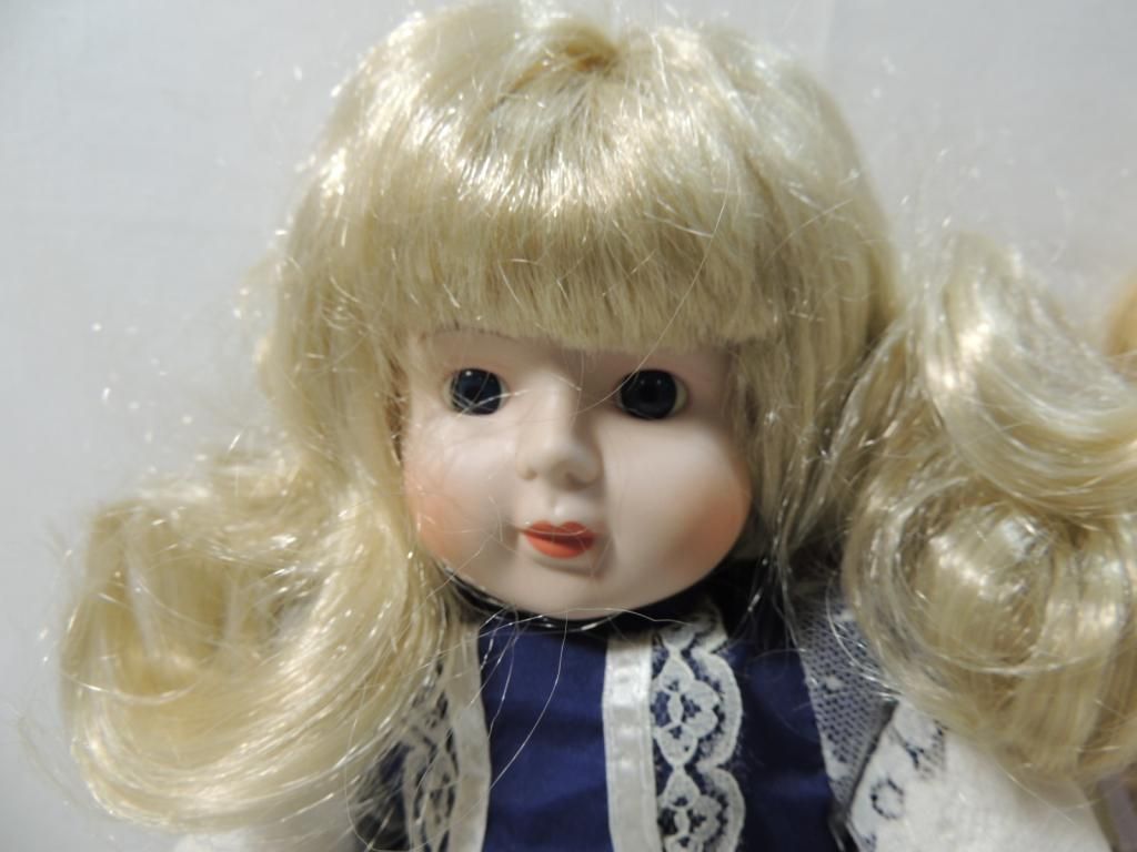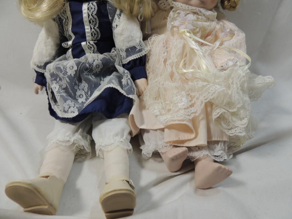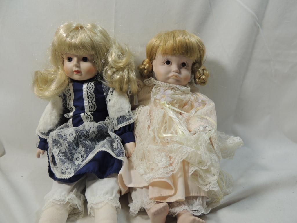 LOT 2 PORCELAIN DOLLS DIFFERENT STYLES AND OUTFITS. AS SHOWN. SEE PHOTO FOR MORE DETAILS.