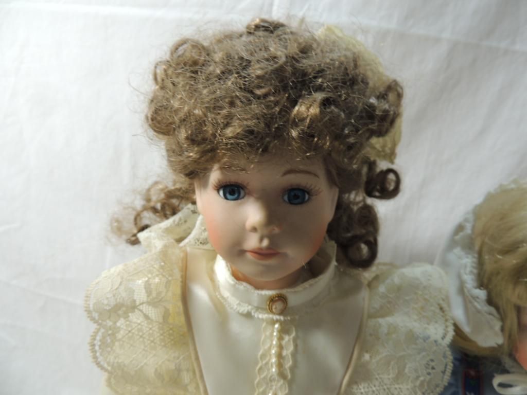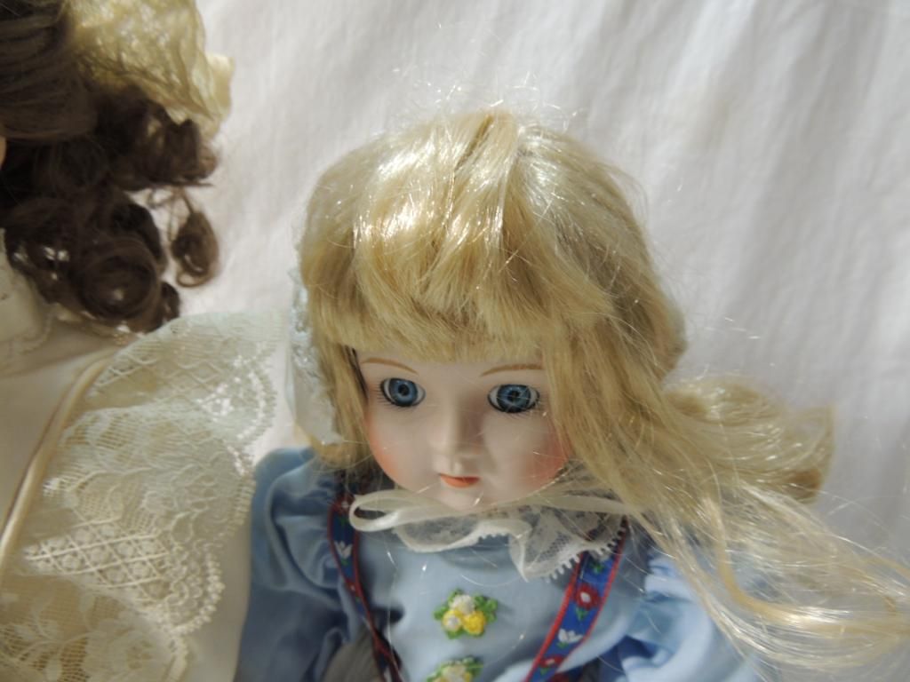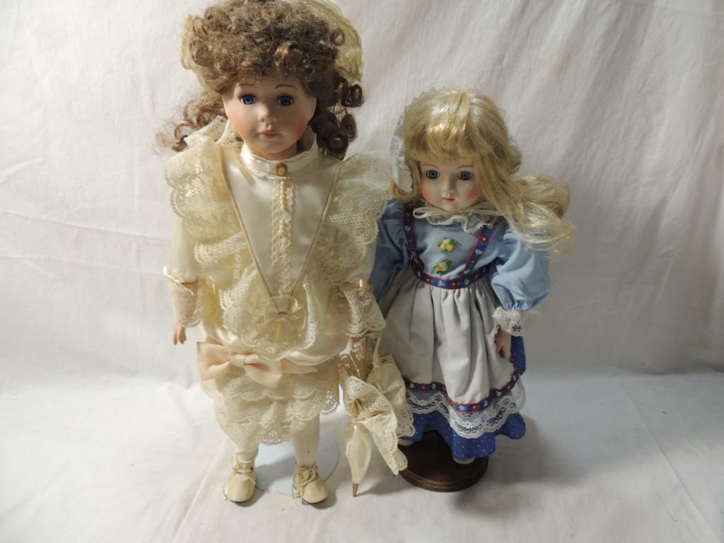 BLONDE HAIR LONG IN BLUE AND WHITE DRESS AND BROWN HAIR BLUE EYES CREAM SATIN DRESS WITH LACE RUFFLE. TWO PORCELAIN DOLLS ON STANDS BEAUTIFUL. COLLECTIBLE. DOLLS. AS SHOWN. SEE PHOTO FOR MORE DETAILS.