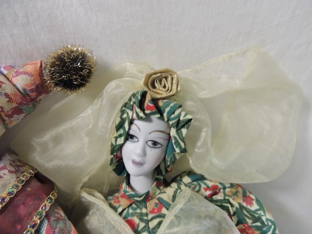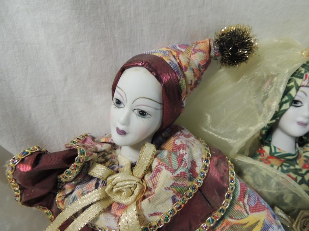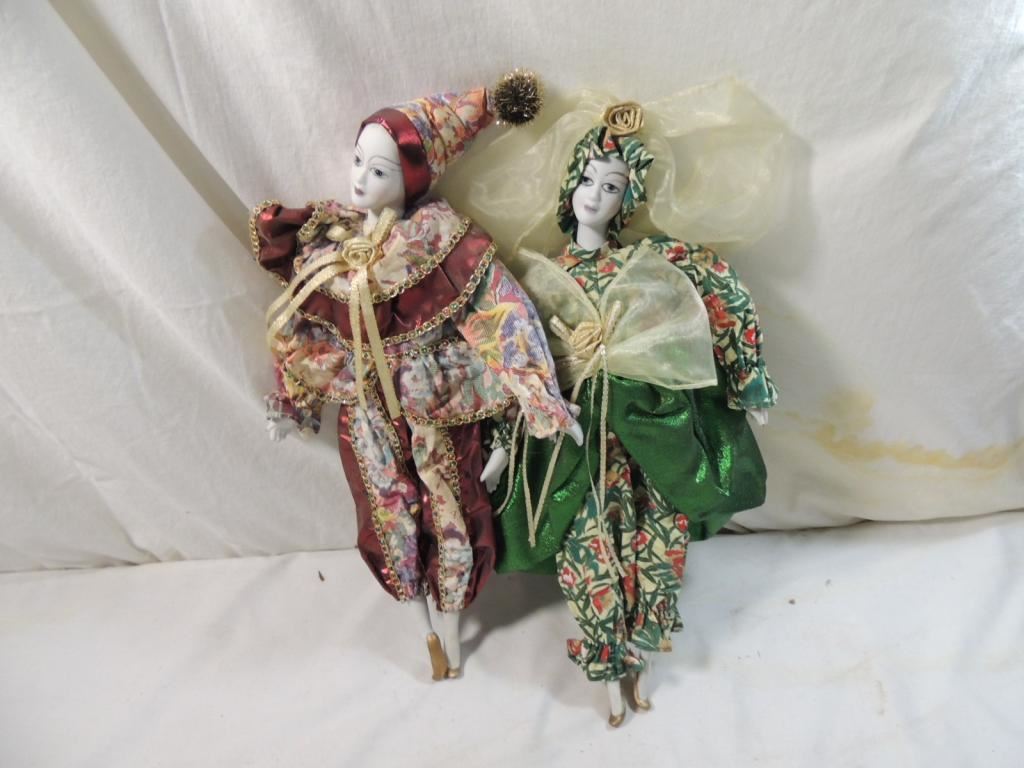 VINTAGE PORCELAIN JESTER DOLLS. COLLECTIBLE JESTER CLOWN DOLLS. GOOD CONITINO AS SHOWN SEE PHOTO FOR MORE DETAILS.