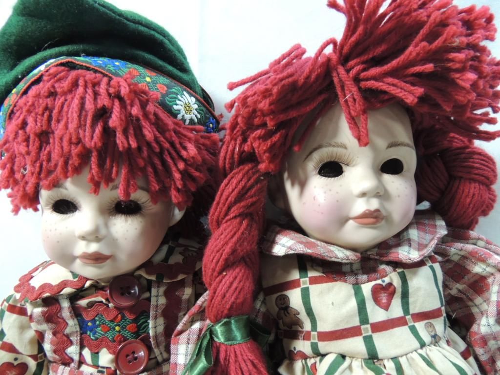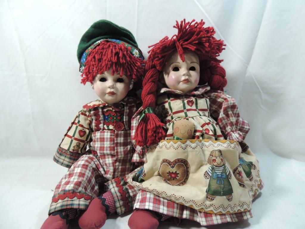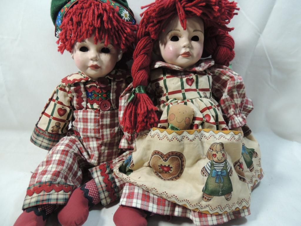 GINGERBREAD THEME DOLLS. APROX 19" TALL. MISSING BOTH EYES. AS SHOWN. SEE PHOTO FOR MORE DETAILS.