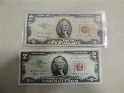 LOT 2 RED SEAL 2 DOLLAR BANK NOTE: 1953C & 1963. AS SHOWN. VIEW PICTURE FOR DETAIL.