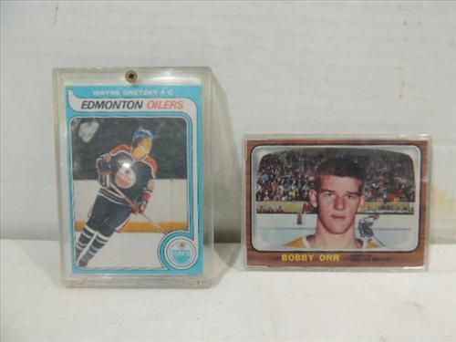 LOT 2 REPRINT CLASSIC HOCKEY PLAYER CARDS: 1965 #35 BOBBY ORR & 1979 #18 WAYNE GRETZKY. AS SHOWN. VIEW PICTURE FOR DETAIL.