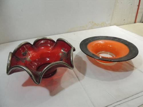 LOT 2 RUFFLED EDGE RUBY GLASS BOWL STERLING SILVER EDGE AND PATTERN. 10.5"D ORANGE & BLACK BOWL. AS SHOWN. VIEW PICTURE FOR DETAIL.