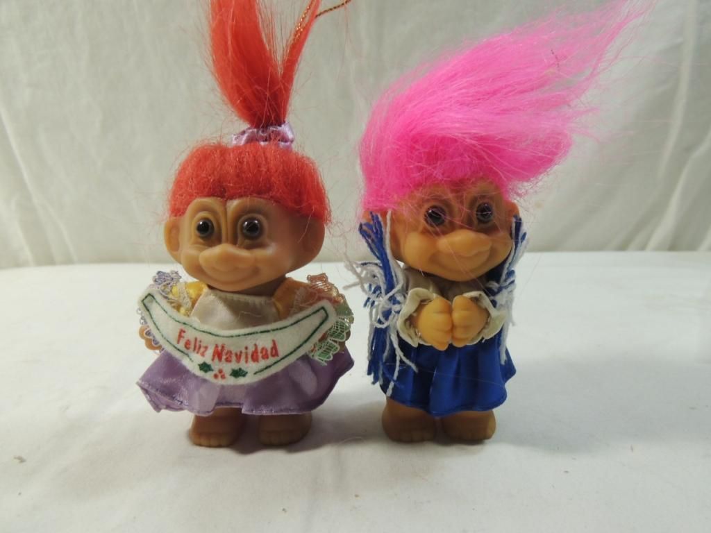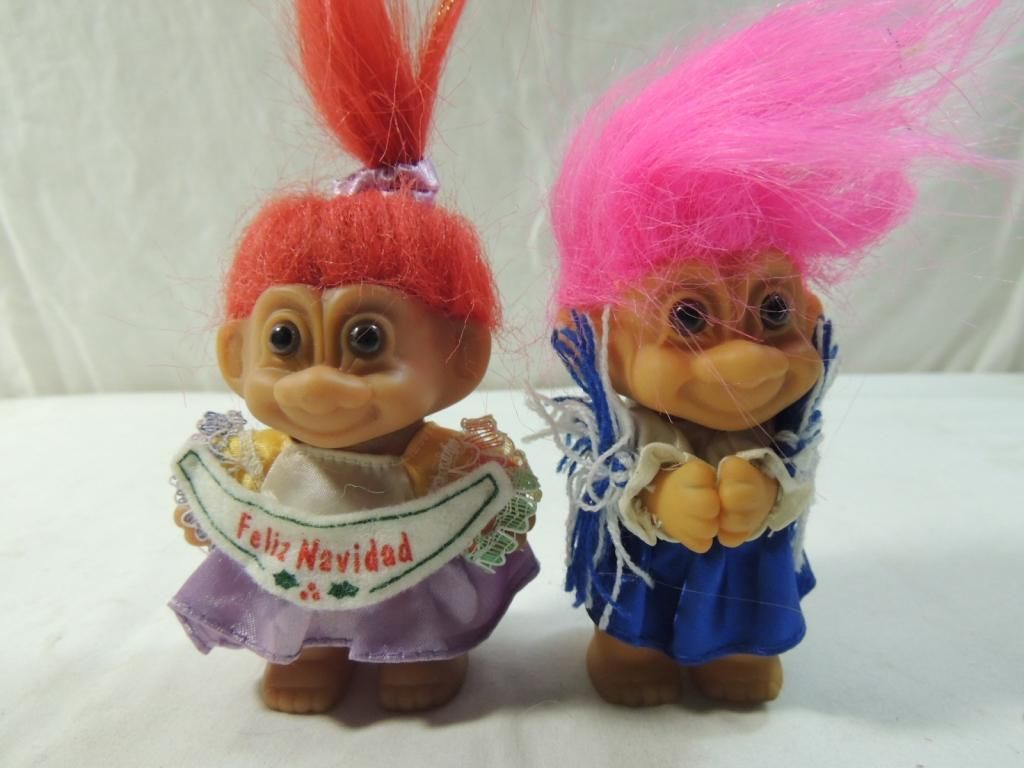 RUSS TROLL DOLLS. COLLECTIBLE. IN GREAT CONDITION. FELIZ NAVIDAD AND CHEERLEADER TROLL DOLLS BRIGHT PINK AND RED HAIR. AS SHOWN SEE PHOTO FOR MORE DETAILS