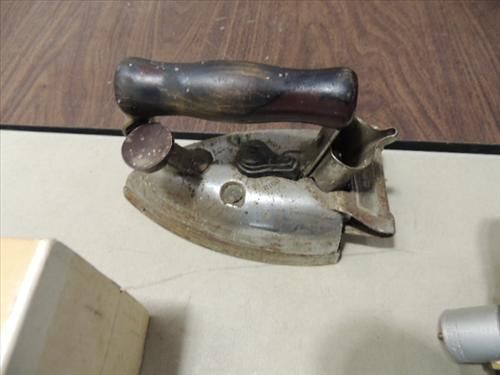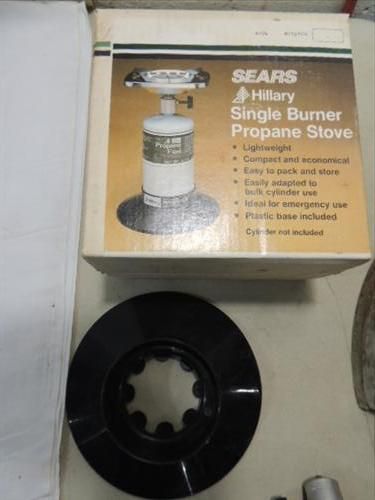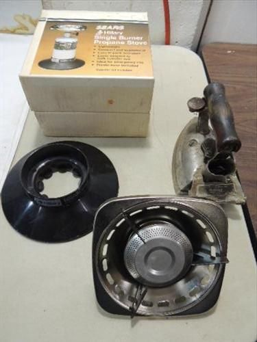 LOT 2 SEARS SINGLE BURNER PROPANE CAMP STOVE & 1930S HOTPOINT ELECTRIC IRON. AS SHOWN. VIEW PICTURE FOR DETAIL.
