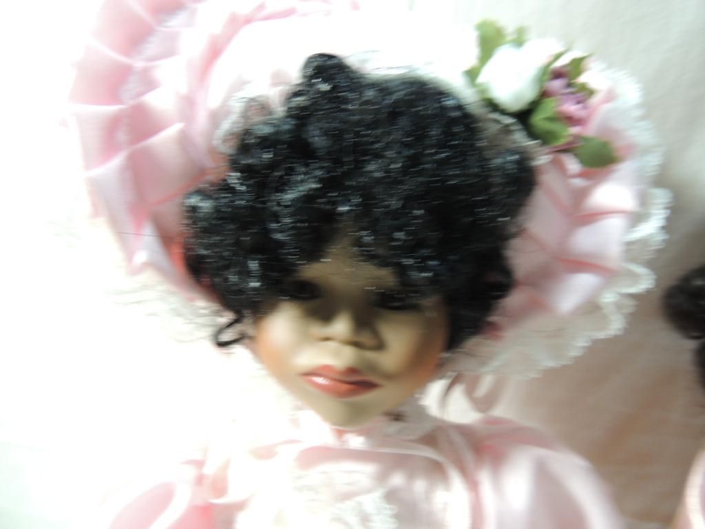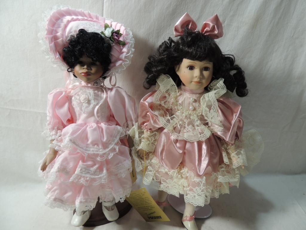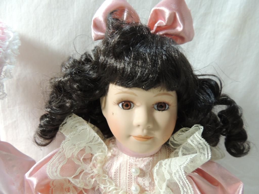 "CLAIRE" PINK RUFFLE DRESS. LACE RUFFLE TRIM. ON STANDS. DARK BROWN CURLY HAIR. TWO PORCELAIN DOLLS ON STANDS BEAUTIFUL. COLLECTIBLE. DOLLS. AS SHOWN. SEE PHOTO FOR MORE DETAILS.