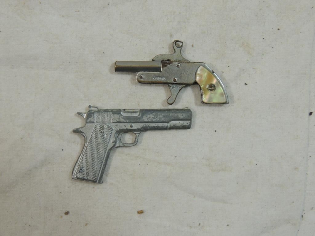 SMALL GUNS, SMALL REPLICA GUNS, VINTAGE GUNS, METAL GUNS AS SHOWN SEE PHOTO FOR MORE DETAILS.