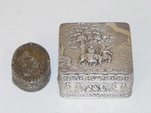 LOT (2) SMALL SILVER BOXES: (1) 2 1/4" SQUARE W/ REPOUSSE DECORATION OF MAN W/ WOMAN & CHILD ON HORSEBACK MARKED .925 W/ HALLMARKS & (1) SMALL OVAL 1 3/4" BOX W/ PUTTI FEEDING DUCKS MARKED PERRUZI .800- 3 TROY OZ.