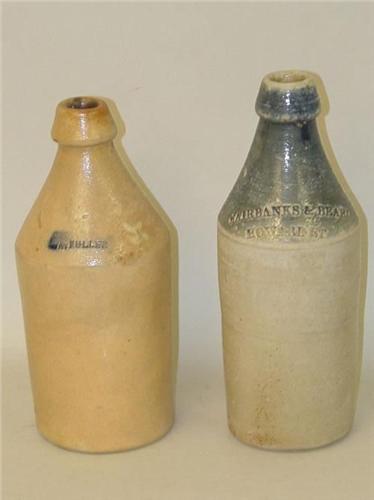 LOT (2) STONEWARE BOTTLES: (1) 10 1/2" FAIRBANKS & BEARD HOWARD ST. W/ COBALT ON SHOULDER & (1) 9 3/4" A. FULLER - SEVERAL POTSTONES