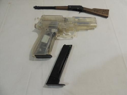 LOT 2 TOY GUNS: MINIATURE RIFLE & KWC P226 PISTOL HAS TWO CARTRIDGES. AS SHOWN. VIEW PICTURE FOR DETAIL.