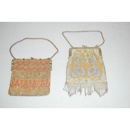 LOT (2) VICTORIAN BEADED LADIES PURSES - (1) SMALL<BR>FLORAL BEADED PURSE & (1) PURSE W/ GEOMETRIC DESIGN-<BR>FLORAL FRAME MARKED LIVINGSTON BROS. FRANCE & OTHER<BR>UNMARKED W/ JEWELED FRAME & CLASP W/ ENAMEL FLOWERS-<BR>WEAR, LOSSES, IMPERFECTIONS