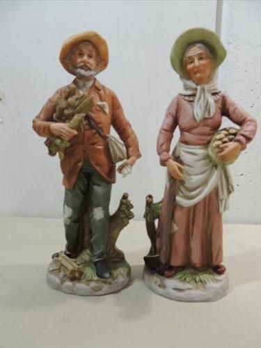 LOT 2 VINTAGE 10"H PORCELAIN FIGURINES: OLD COUNTRY MAN & WOMAN. AS SHOWN. VIEW PICTURE OFR DETAIL.
