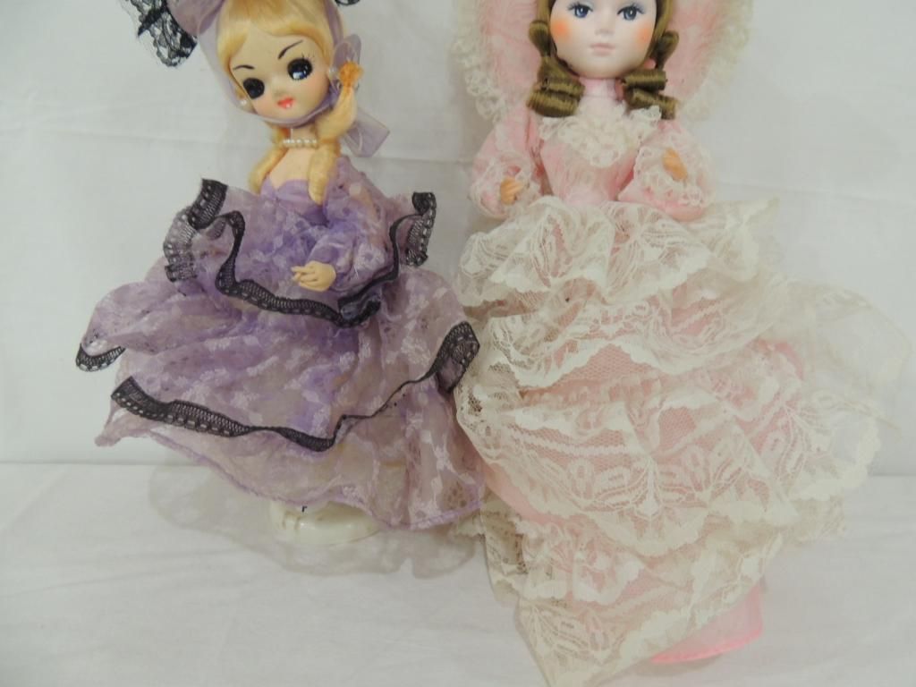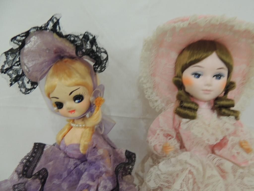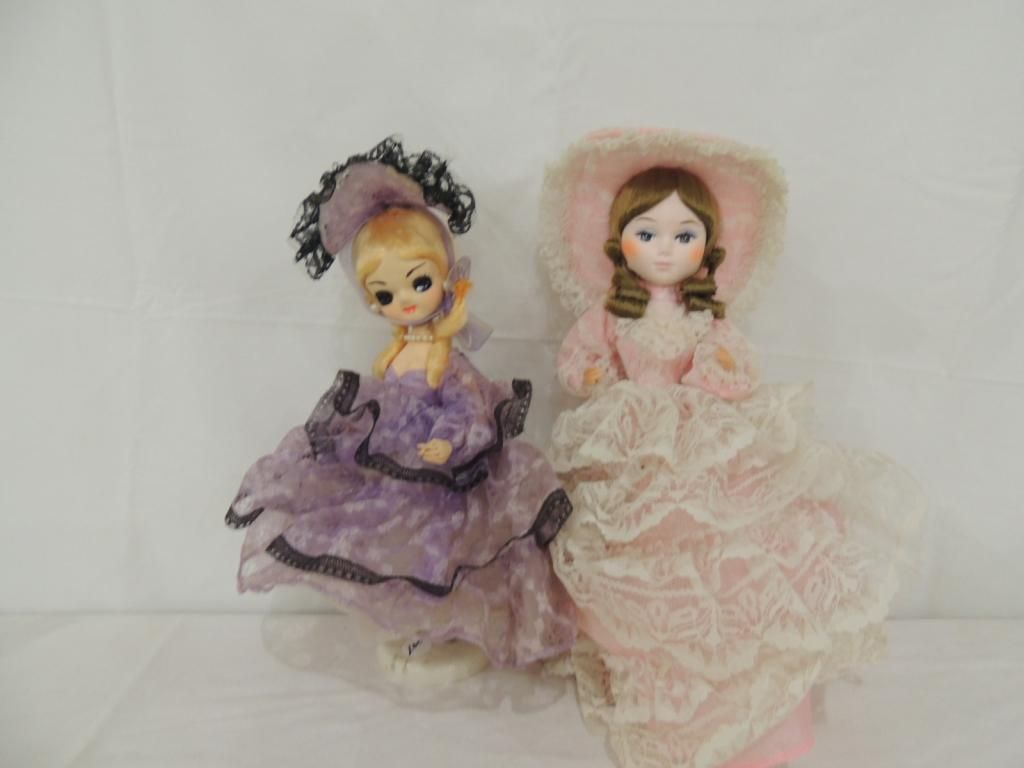 LOT 2 VINTAGE BRADLEY DOLLS. PURPLE DRESS AND PINK DRESS. AS SHOWN. SEE PHOTO FOR MORE DETAILS.