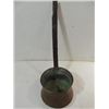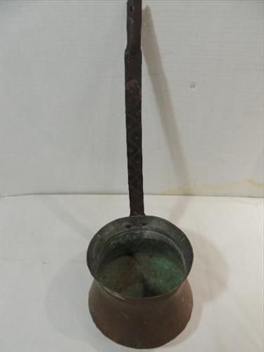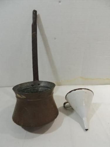 LOT 2 VINTAGE COLLECTIBLES: 1 ENAMAL FUNNEL, 1 LARGE COPPER DIPPING LADEL WITH IRON HANDLE. AS SHOWN. VIEW PICTURE FOR DETAIL.